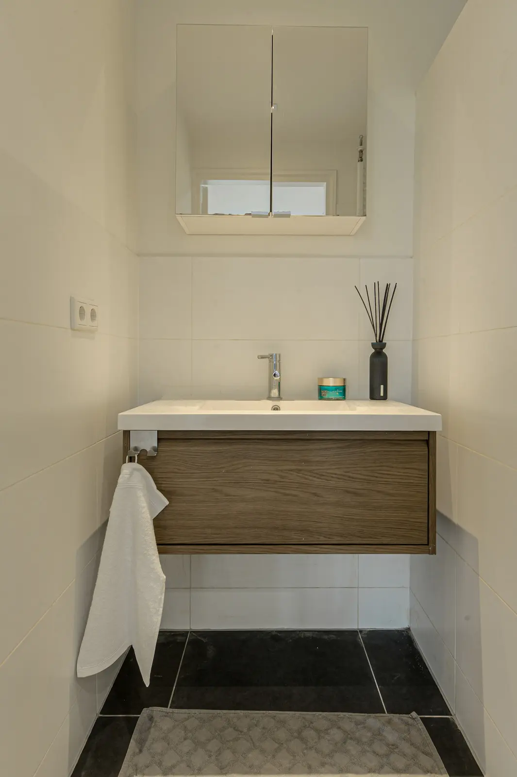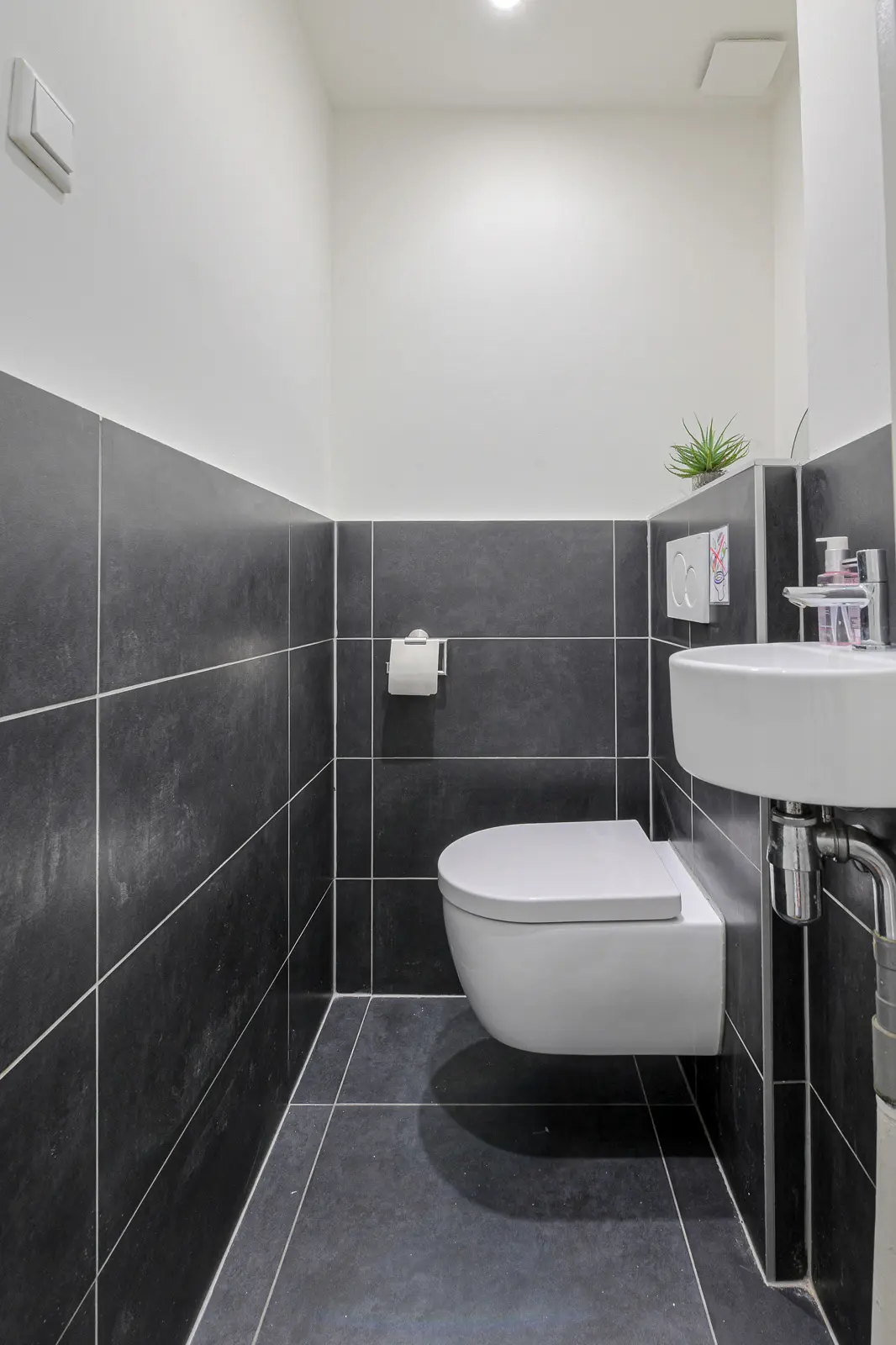 Het toilet is modern uitgevoerd met een zwevend closet, fonteintje, automatische ventilatie.