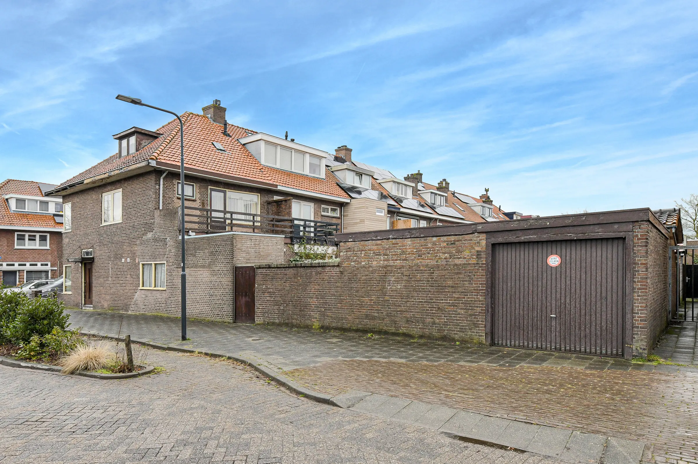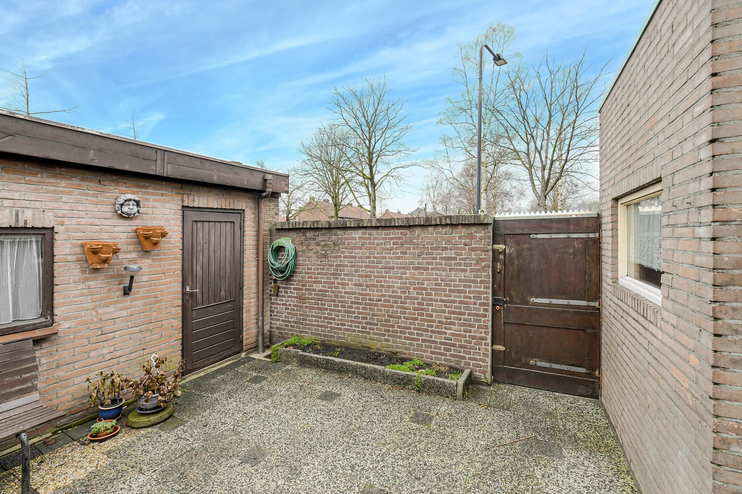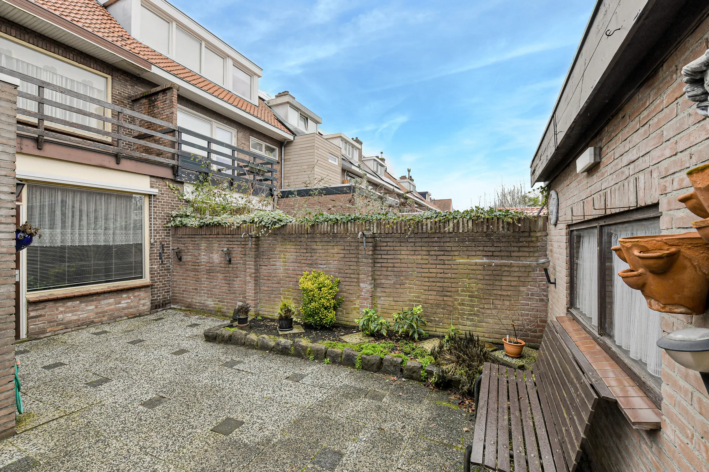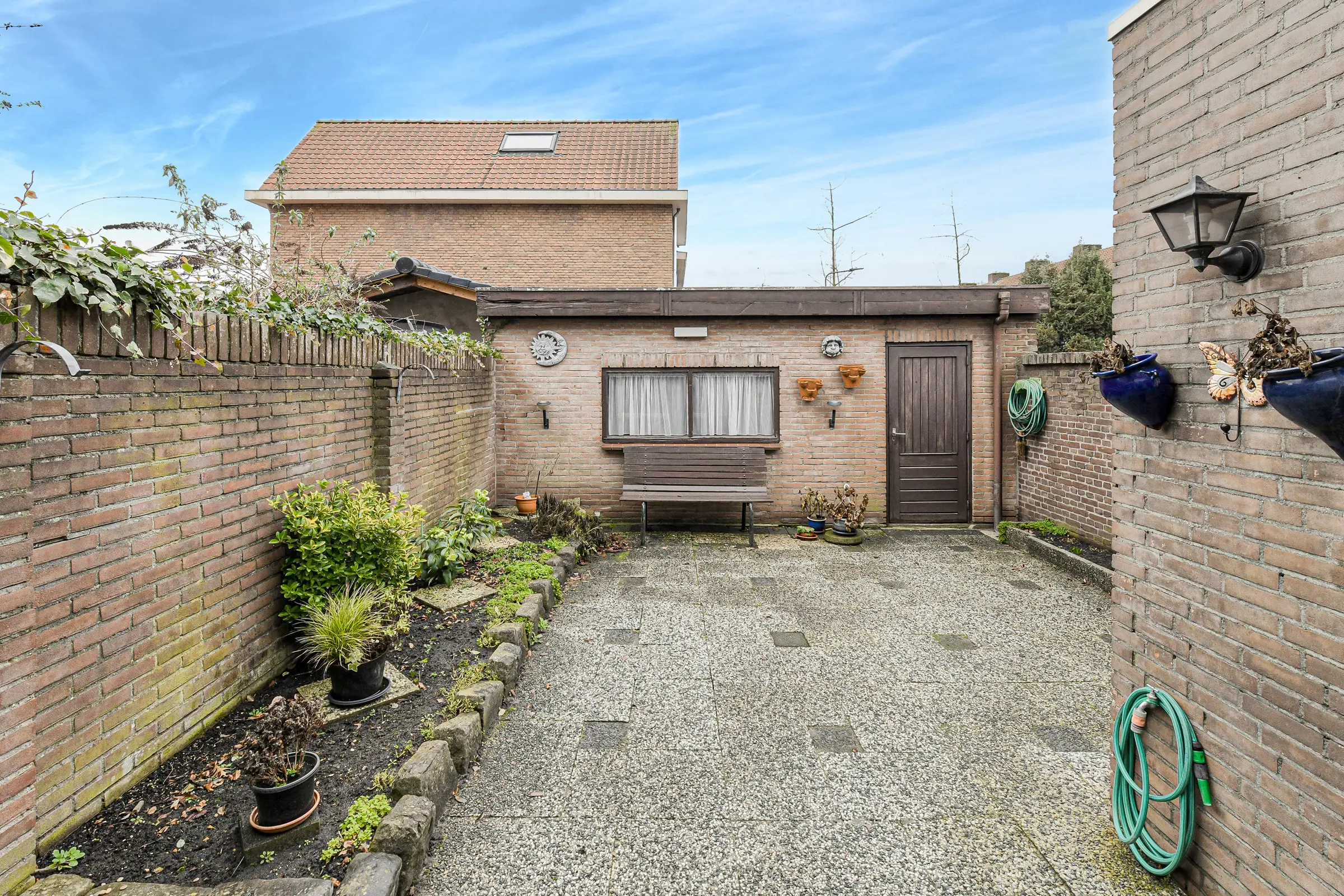 De betegelde achtertuin ligt gunstig op het zuidwesten en heeft toegang tot de extra brede garage en een achterom.