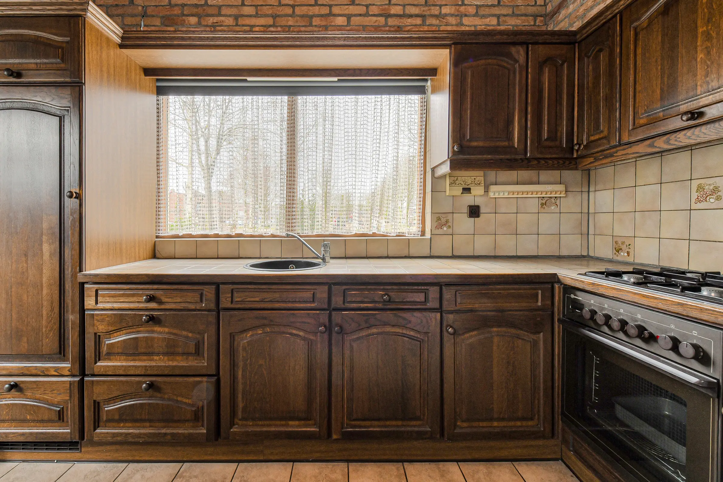 De open keuken in donkerbruine eiken uitvoering grenst aan de praktische bijkeuken. Deze ruimte biedt volop mogelijkheden: zo kan de bijkeuken bij de keuken worden betrokken voor extra leefruimte of kan de keuken worden samengevoegd met de woonkamer om een royale, moderne leefkeuken te creëren.