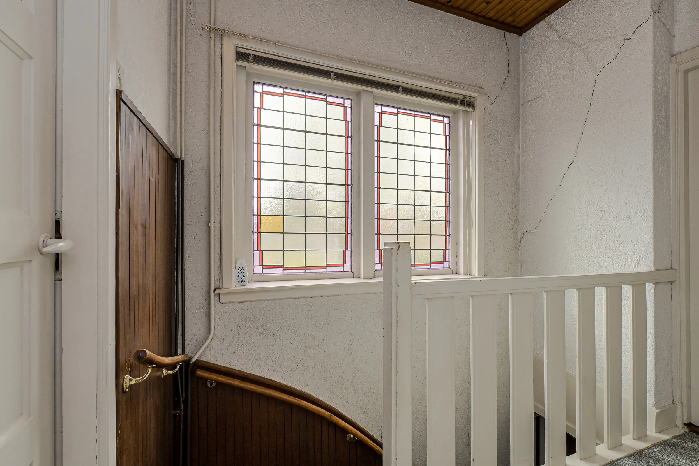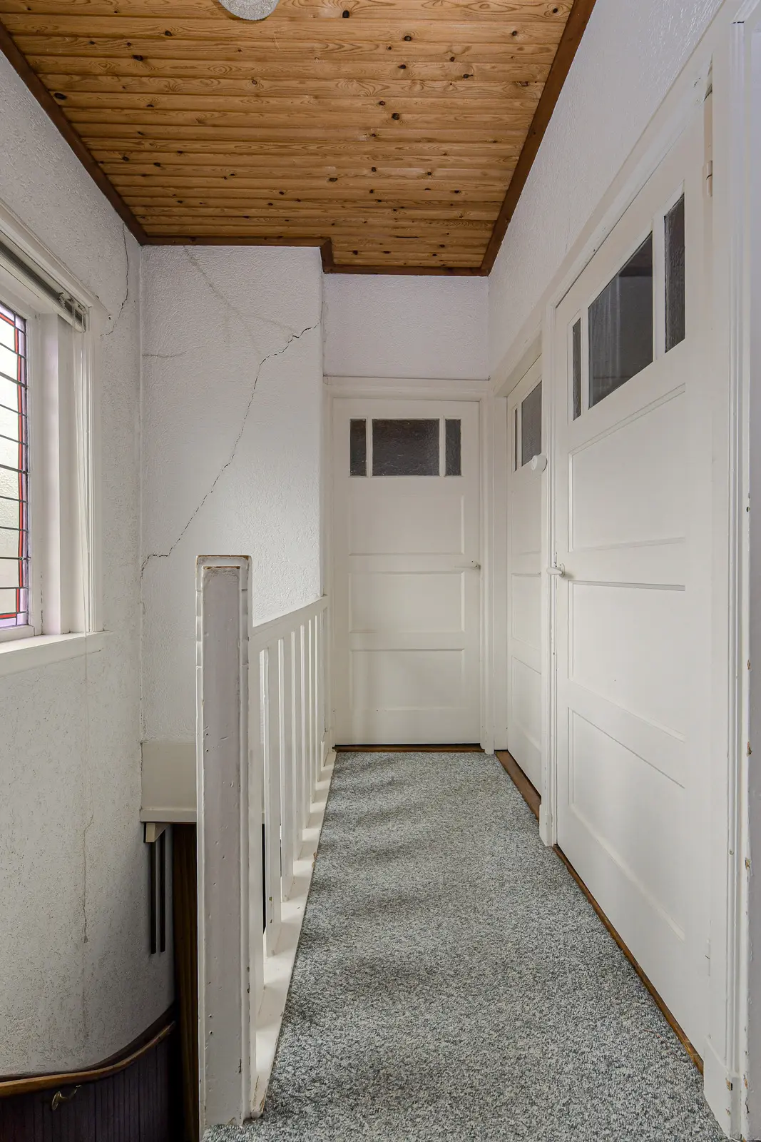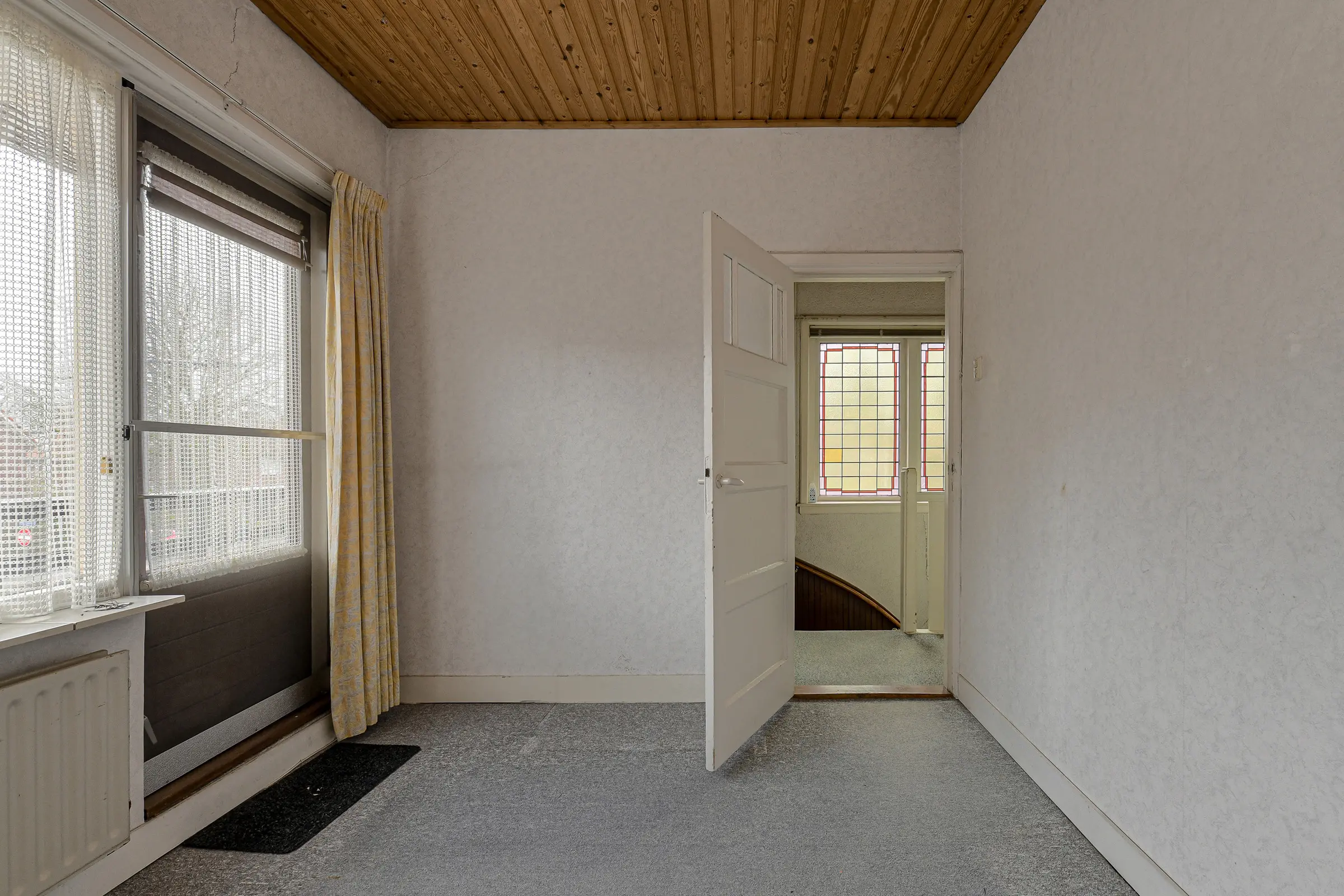 Overloop met toegang tot drie slaapkamers, allen voorzien van karakteristieke traditionele paneeldeuren, de badkamer en de vaste trapopgang naar de zolder. De slaapkamer aan de achterzijde beschikt over een balkondeur, wat zorgt voor extra lichtinval en een prettige verbinding met het ruime balkon. Langs de trapopgang bevinden zich aan de zijkant van de woning fraaie glas-in-loodramen, die het geheel voorzien van karakter en een authentieke jaren ’30 uitstraling.